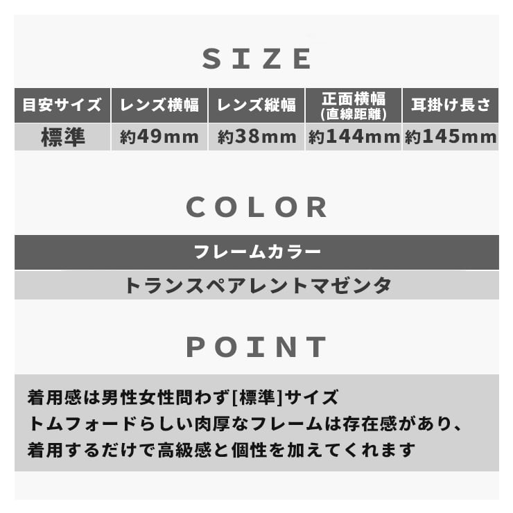 伊達メガネとしてすぐに使用ができ、左レンズ上部にはTOMFORDのロゴが刻印されています。
