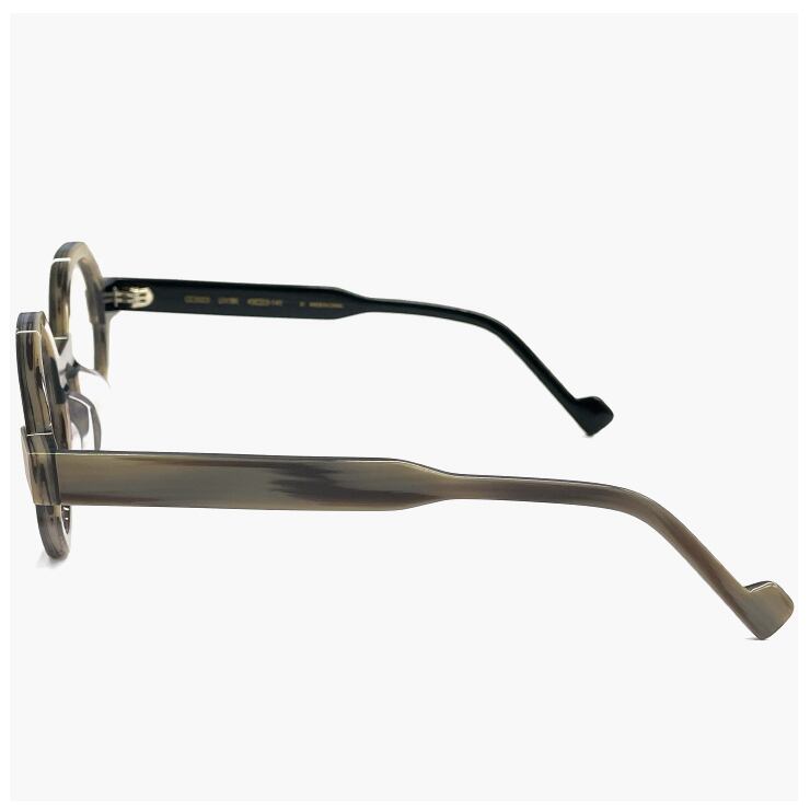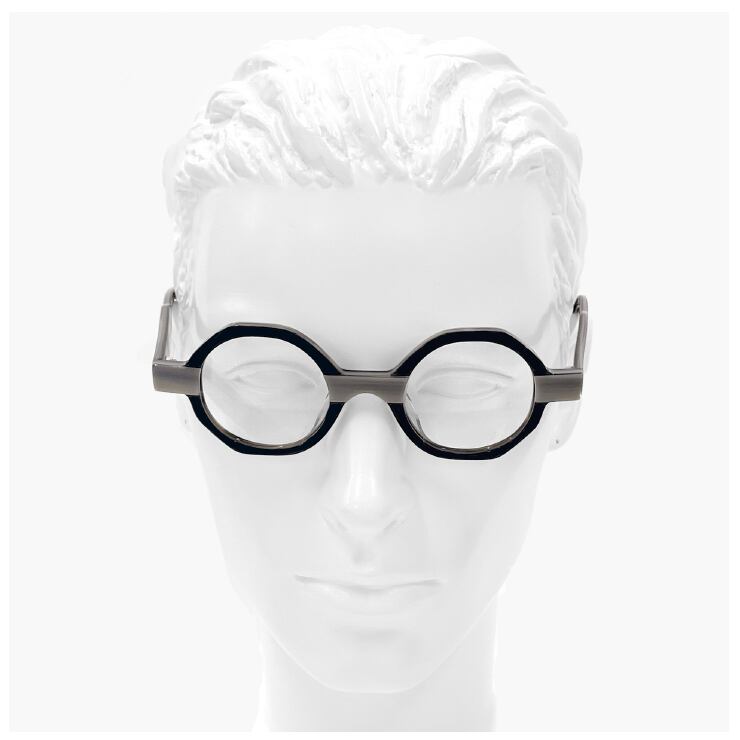 異なる風合いのアセテート生地を張り合わせ、フレームの形状にカッティングすることでメリハリのあるツートンカラーに仕上げています。