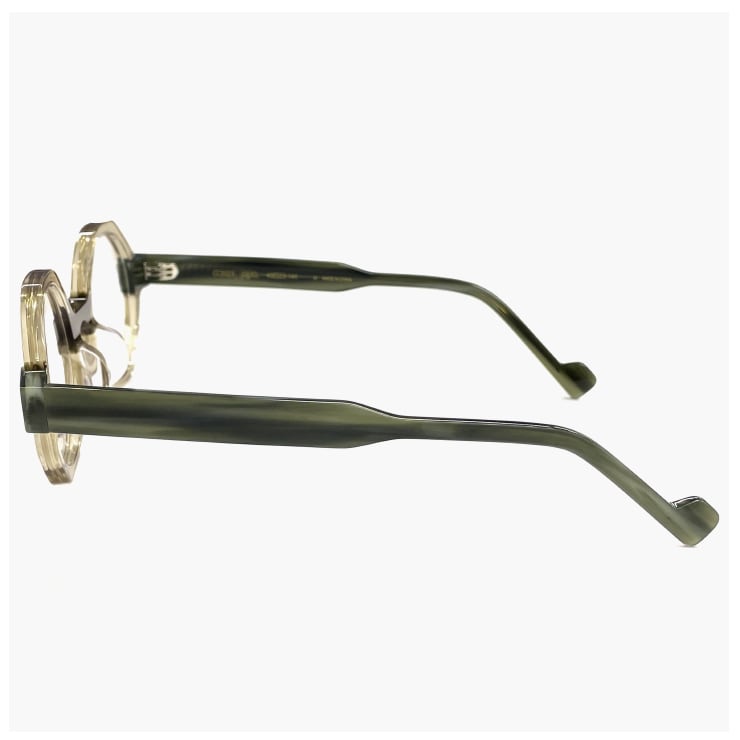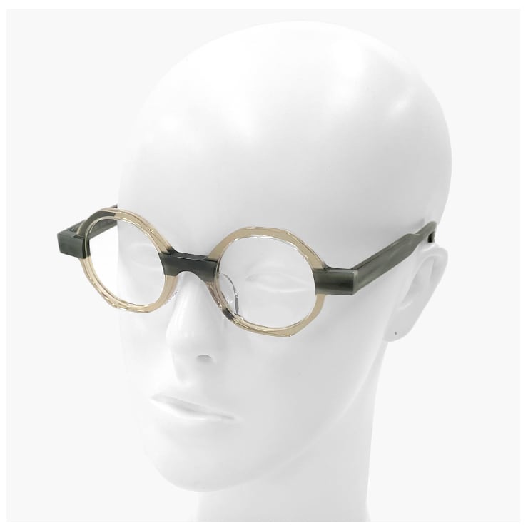 異なる風合いのアセテート生地を張り合わせ、フレームの形状にカッティングすることでメリハリのあるツートンカラーに仕上げています。