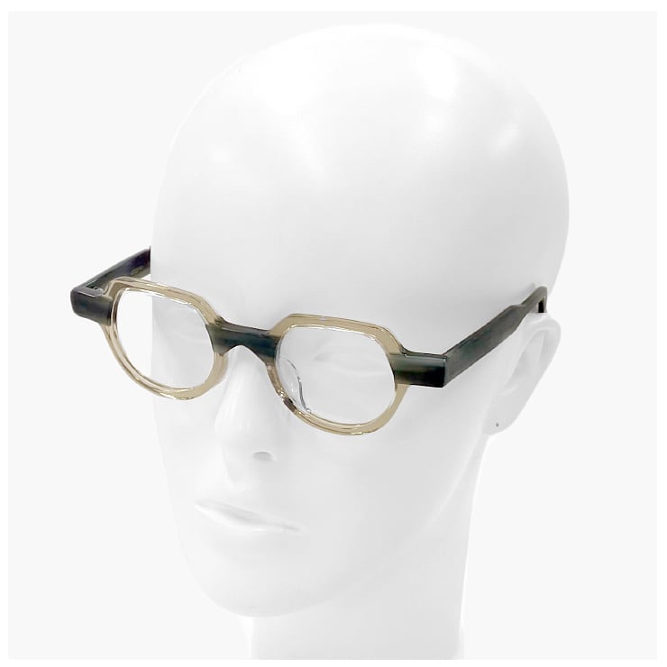 異なる風合いのアセテート生地を張り合わせ、フレームの形状にカッティングすることでメリハリのあるツートンカラーに仕上げています。