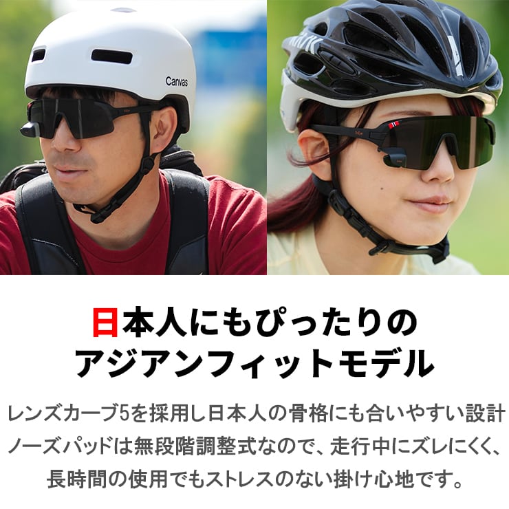 5カーブのレンズは日本人の骨格に合いやすく、無段階調節可能なノーズパッドで快適な着用感。