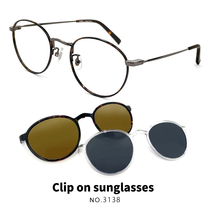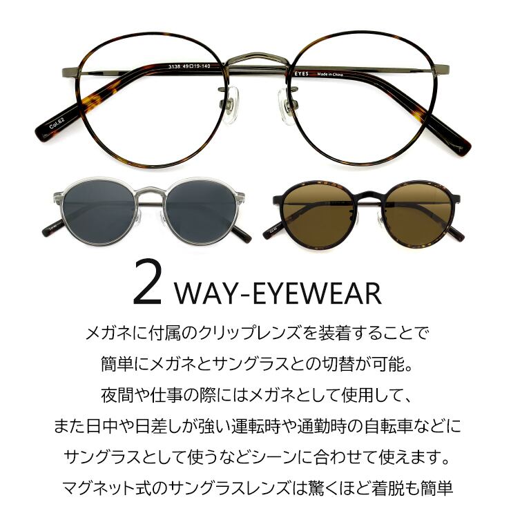 クリップオン サングラス 偏光 レンズ付き 眼鏡 3138-62 メガネ メンズ レディース ユニセックス クリップオンサングラス 偏光サングラス メタル ボストン型 フレーム 度付き対応 サングラス